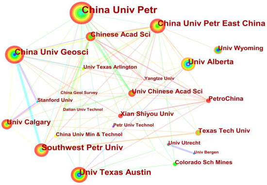 The institutional cooperation network for imbibition research in unconventional reservoirs is shown in Figure 5. It can be seen that the research institutions of many papers are from China, the United States, and Canada. Among them, the main research institutions in China are the China University of Petroleum (208 papers), China National Petroleum Corporation (95 papers), Southwest Petroleum University (87 papers), China University of Geosciences (86 papers), and the China University of Petroleum (East China) (85 papers). Research institutions in the United States mainly include the University of Texas System College (105 papers), the University of Texas at Austin (72 papers), the U.S. Department of Energy (55 papers), and Texas Tech University (43 papers). Canadian institutions mainly include the University of Alberta (68 papers), the University of Regina (13 papers), and the University of Manitoba (6 papers).