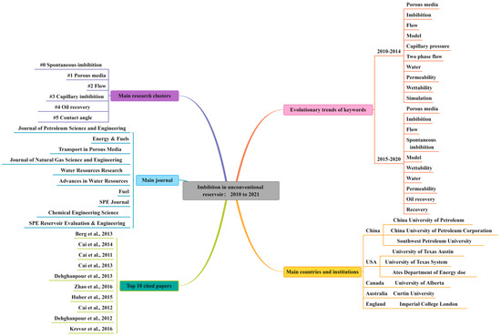According to the results of scientometric analysis, the comprehensive knowledge map of imbibition research in unconventional reservoirs is shown in Figure 14. Combined with the Citespace system analysis map, the main research on imbibition in unconventional reservoirs from 2010 to 2021 is summarized in various aspects. Existing research results and areas of knowledge are systematically discussed to advance the understanding of the existing body of knowledge in the field.