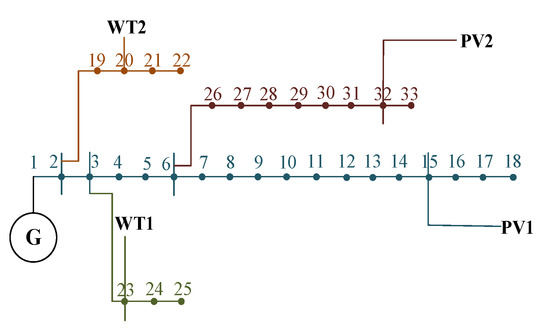 This work designs a simulation experiment based on the extended IEEE-33 node test system [32]. The system topology is shown in Figure 3. Meanwhile, this work accesses two wind DGs with an installed capacity of 1 MW as well as two photovoltaic DGs with an installed capacity of 0.9 MW at nodes 15 and 32 as well as 23 and 20, respectively. In addition, the main parameters of ADN are shown in Table 1, whilst the main parameters of the different algorithms are shown in Table 2. The main parameters of the algorithms can be deduced from a uniform design, as determined in [33,34,35]. Table 3 shows the main cost of ESS [36,37,38,39]. It should be noted that the installation node position of DG in this paper was completed before configuring ESS by referring to the previous work [40] and the method in the literature [41].