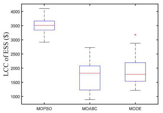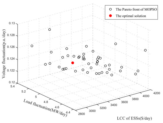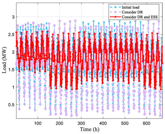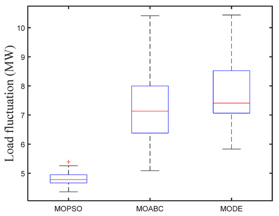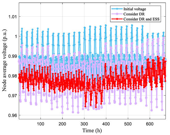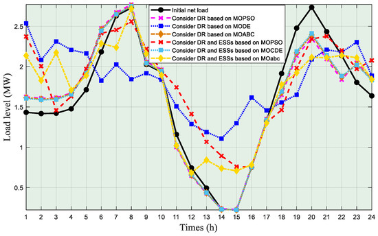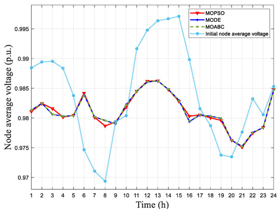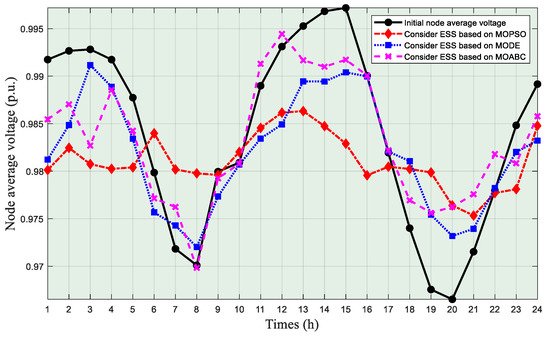 The optimization results of the upper-level model are shown in Table 4. Residents can achieve the maximum improvement in load fluctuation within a reasonable range of electricity comfort through the lower purchase cost than without considering the time of use electricity price based on the new price scheme formulated by MOPSO, MOABC, and MODE, respectively. In addition, the optimal configuration scheme formulated by different algorithms of ESS based on IGTDM is shown in Table 5, Table 6 and Table 7. From Table 5, Table 6 and Table 7, it can be concluded that ESS based on the MOPSO configuration can most significantly reduce the load fluctuation and voltage fluctuation of ADN. Compared with MODE and MOABC, the net load fluctuation of ESS based on MOPSO is reduced by 22.93% and 28.76%, respectively. Meanwhile, the voltage fluctuation is reduced by 41.39% and 45.64%, respectively. In summary, although the LCC optimized by MOPSO is slightly higher than the other two algorithms, the stability of ADN can be most significantly improved by ESS based on MOPSO configuration. Therefore, according to the above configuration scheme, four ESSs are configured near the distributed power supply, which cannot quickly suppress the influence of the unstable output of DG on the stability of ADN. Figure 4 and Figure 5 are the load and voltage fluctuation curves of ADN after ESS access under the condition of considering DR. It should be noted that the average node voltage in Figure 5 is averaged by the node voltage values of all nodes. Based on the above, it can be concluded that the reasonable configuration of the ESS can stabilize the load and improve the stability of ADN.
