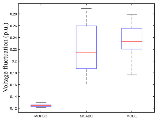 The influence of different access location conditions on voltage fluctuation is verified by only changing the location of BESS when the capacity did not change. Table 11 shows the values of voltage fluctuation when BESS is connected to the optimal location obtained by MODE and MOABC under the condition of constant capacity and charge–discharge power, respectively. When node 2 and node 6 are connected to BESS, the voltage fluctuation decreases by 0.72% and 0.64% compared with the two other conditions, respectively. Figure 15 is the curve of voltage fluctuation at different access locations of BESS. On the whole, it can be seen that the proposed model is feasible and the algorithm is superior.