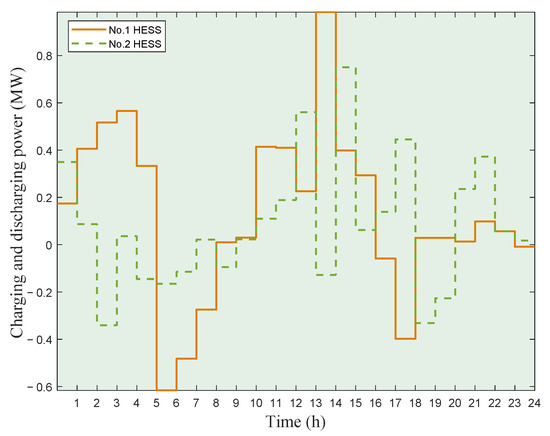 where represents the number of BESS installations; represents the capacity of BESS; represents the rated power rating of BESS; represents the cost of battery; and represents the cost of the inverter. represents the recovery coefficient of the equal annual value of BESS. denotes the lifetime of BESS and HESS; denotes the discount rate [26].
