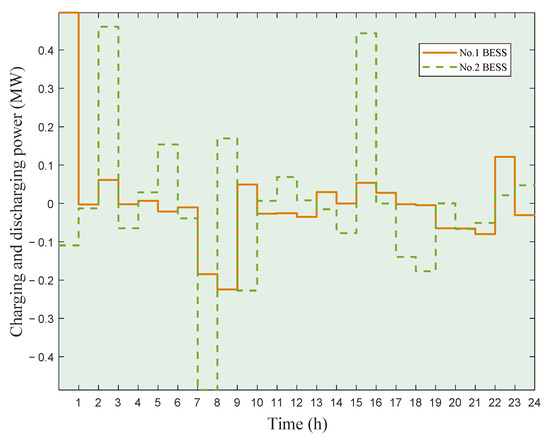 where represents the charging power of BESS at time ; represents the discharge power of BESS at time ; and represent the charge–discharge efficiencies of BESS, respectively.