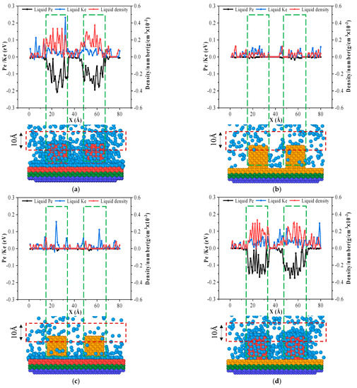 In order to more accurately describe the coupling effect of different nanostructure wetted surfaces on argon atoms, Figure 3 shows the changing trend of kinetic energy, potential energy and x-axis density of argon atoms on the nanostructure surface in the evaporation region of 10 Å above the wall at 1 ns. Kinetic energy (Ke) refers to the ability of argon atoms to move due to interaction on the wetted surface. The higher the speed, the greater its kinetic energy. Potential energy (Pe) refers to the energy generated by the interaction between molecules, which is divided into repulsion force and attraction force. The stronger the hydrophilicity is, the greater the absolute value of the surface potential energy is. As shown in Figure 3a,d, the potential energy values on the pure hydrophilic surface 1 and the mixed wetted surface 4 are −0.2 ev and −0.16 ev, respectively. The Pe values of these two surfaces are similar in the whole surface area. Interestingly, the argon atom density and potential energy on the nanochannels of the pure hydrophilic surface 1 show an obvious symmetrical opposite trend (marked by the green box in the figure). As shown in Figure 3b,c, the potential energy value on the pure hydrophobic surface 2 and the mixed wetted surface 3 tends to be close to 0, and the attraction to atoms is smaller, so that the surface hydrophobicity is a reasonable explanation for describing this phenomenon. In addition, the argon atom density in the hydrophobic region is significantly lower than that in the hydrophilic region. It is worth pointing out that under the action of nanostructures, the two wettability surfaces are limited by surface pits, showing different nucleation states. The hydrophilic surface is covered with an adsorbed liquid layer, and the nucleation of nanobubbles is in the center of the pit. The bubble nucleation on the hydrophobic surface is on the wall, and there are more bubble nucleation points. The adsorption liquid layer and gas nucleation point under the mixed wetting surface appeared at the same time.