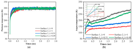 Temperature changes of platinum and argon atoms on the nanostructured wetted surface under 298 K temperature input: (a) platinum atom (b) argon atom.
