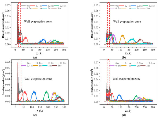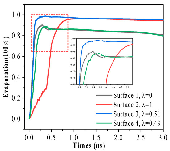 Figure 5a–d shows the numerical density changes of the liquid layer in the z-axis of the surfaces in the time periods of 0 ns, 0.1 ns, 0.2 ns, 0.3 ns, 0.5 ns, 1 ns, 2 ns, and 3 ns. The simulation results show that the density change of the liquid layer above the heated nanosurface shows a consistent change law. With the increase in temperature, a large number of liquid layers evaporate and converge into small clusters, and the maximum value of the numerical density decreases rapidly and moves up the z-axis. For the pure hydrophilic nanostructure surface, more heat is transferred to the structure surface to produce a gas–liquid phase transition. The maximum value decreases by 50% at 0.1 ns, and the liquid layer reaches its highest point at 0.3 ns. For the surface of pure hydrophobic nanostructures, the maximum value of the number density changes more gently. In order to more accurately analyze the evaporation phenomenon of the liquid layer on different wetted surfaces, the area of 10 Å above the nanostructure is defined as the wall evaporation area (described by the red dotted box). According to the numerical density value given in Figure 5, the evaporation rate is defined as the ratio of the number of argon atoms in the evaporation region at each moment to the initial number of atoms in the evaporation region. The specific value is given in Figure 6. In all cases, the evaporation rate of liquid atoms on the surface of nanostructures increases significantly with the increase in temperature. The maximum evaporation rate of surface 1 (H = 18, λ = 0) at 0.28 ns was 90.2%; on Surface 2 (H = 18, λ = 1), the maximum evaporation rate was 96.3% at 1.53 ns; on surface 3, (H = 18, λ = 0.51) of the maximum evaporation rate is 98% at 0.31 ns; on Surface 4, (H = 18, λ = 0.49) reached the maximum evaporation rate of 88.5% at 0.38 ns. It is worth noting that the argon atom evaporation rate of the pure hydrophobic surface was significantly higher than that of the pure hydrophilic surface. For the mixed wetted surface with λ = 0.51, the time to reach the maximum evaporation rate was only 1/5 of surface 2, and the maximum evaporation rate was 13.7% higher than surface 1.