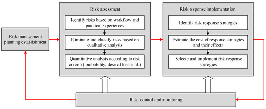 According to recent studies in the field of project risk management, overall risk management can be generally summarized into four stages that include risk management planning, risk assessment, risk response, and risk control and monitoring [34]. As shown in Figure 1, defining responsibility and providing a complete action plan for project risk management is the initial step. In the next stage, including risk identification as well as risk qualitative and quantitative analyses is necessary, and this stage is the uppermost level of risk management. Risks are identified and classified according to the workflow and previous experiences with similar projects; different assessment criteria are adopted to quantitatively rank the risks, such as probability or desired loss. According to the above assessment results, optimal risk response strategies are selected for each risk after evaluating the cost of implementing strategies and their effects. Finally, continuous risk monitoring is part of the overall risk management in order to realize the sustainable goals.