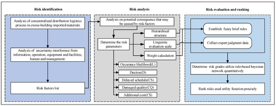To solve the aforementioned questions, this paper first establishes a complete list of risk factors through analyzing the concentralized distribution logistics practical process in cruise-building imported materials. Then, we present an improved failure modes and effects analysis (FMEA) approach considering the powerful advantage of FMEA in risk management application. Specifically, risk parameters are expanded from five aspects, including occurrence likelihood (L), detectability (D), delayed schedule (CS), damaged quality (CQ), and additional cost (CC). Meanwhile, a detailed description of the linguistic grades of the parameters is made. Subsequently, a fuzzy belief rule (FBR) is established based on risk parameter structure and weights. Finally, rule-based Bayesian network (RBN) and utility function are employed to calculate and rank the risk index (RIN) of various risks. This method based on integrating the uncertainty reasoning can effectively solve the challenge of insufficient quantitative data. In this way, it contributes to the theoretical references for the further risk controls of CDL-CIMs.
