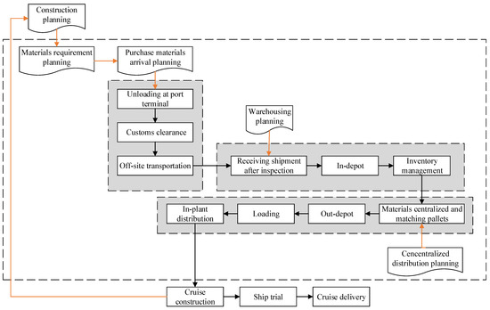 This section identifies risk factors through an analysis of the concentralized distribution logistics process based on the business process analysis method. Through investigating the participants and operation process of the CDL-CIMs of Chinese cruise-building enterprises, the typical workflow is obtained, as shown in Figure 3, which can be divided into three stages: off-site handing and transportation, storage at shipyard, and distribution to the production site.