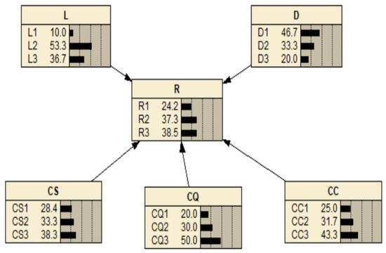 According to the three-grade evaluation scale as seen in Table 2, the subjective probability distributions from multiple experts’ judgments are merged using a weighted average approach based on the contribution of each expert. Due to the similar seniority of the five experts, an equal weight was assigned to each expert. We obtain the DoB for the five parameters (L, D, CS, CQ, CC) of risk factors listed in Table 1 as the input information of the RBN.