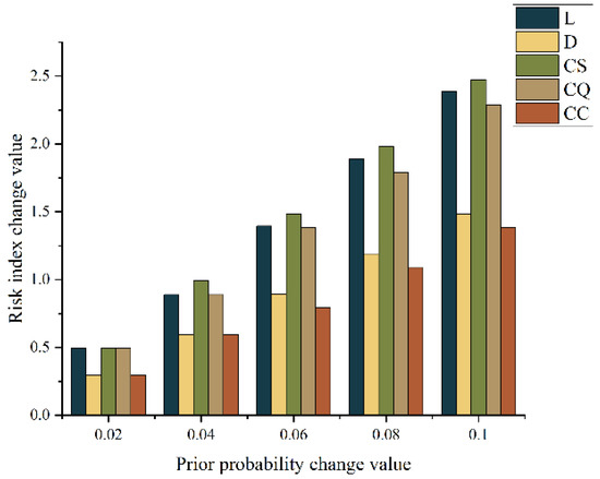 Further, a sensitivity analysis based on an interval [0, 0.1] is used for each risk parameter, where the change in the expert′s evaluation probability from 0 to 0.1 with 0.02 steps moves toward the maximal increment of the RIN. It can be seen from Figure 7 that there is a remarkable difference in the impact magnitudes of the expert′s evaluation probability changes on the RIN, and the impact magnitudes of RIN flow satisfy with the weight ratios of five risk parameters (CS > L > CQ > D > CC) in Section 3.2.1. In summary, it was verified via sensitivity analysis that the model is robust and the results are reliable.