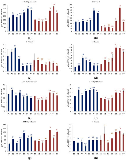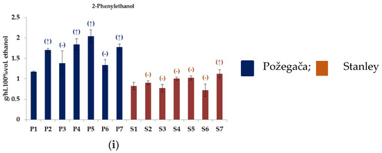 Content of higher alcohols (g/hL 100% vol. ethanol) in plum spirits of Požegača (P) and Stanley (S) varieties produced by traditional method (P1 and S1) and modified methods (P2–P7 and S2–S7): (a) TA, (b) A1, (c) A2, (d) A3, (e) A4, (f) A5, (g) A6, (h) A7, and (i) A8. (Codes are listed in Table S1 of Supplementary Materials.) For each plum variety, different marks indicate differences in the means (p < 0.05), according to Dunnett test: (↑) Statistically significant higher values compared to values in traditionally produced plum spirit, (↓): Statistically significant lower values compared to values in traditionally produced plum spirit, (-): No statistically significant differences in values compared to values in traditionally produced plum spirit. Concentrations of all parameters are shown as mean ± standard deviation.