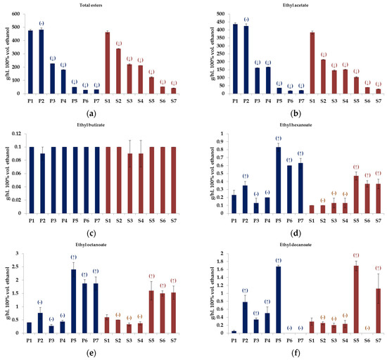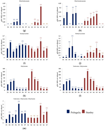 Content of esters (g/hL 100% vol. ethanol) in plum spirits of Požegača (P) and Stanley (S) varieties produced by traditional method (P1 and S1) and modified methods (P2–P7 and S2–S7): (a) TE, (b) E1, (c) E2, (d) E3, (e) E4, (f) E5, (g) E6, (h) E7, (i) E8, (j) E9, (k) E10, (l) TE-E1, and (m) TE-E1-E10. (Codes are listed in Table S1 of Supplementary Materials.) For each plum variety, different marks indicate differences in the means (p < 0.05), according to Dunnett test: (↑) Statistically significant higher values compared to values in traditionally produced plum spirit, (↓): Statistically significant lower values compared to values in traditionally produced plum spirit, (-): No statistically significant differences in values compared to values in traditionally produced plum spirit. Concentrations of all parameters are shown as mean ± standard deviation.