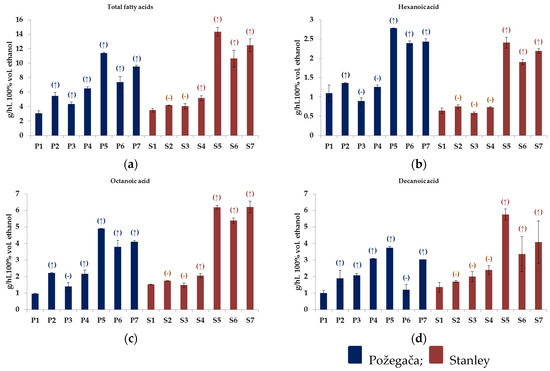 Content of fatty acids (g/hL 100% vol. ethanol) in plum spirits of Požegača (P) and Stanley (S) varieties produced by traditional method (P1 and S1) and modified methods (P2–P7 and S2–S7): (a) TFA, (b) FA1, (c) FA2, and (d) FA3. (Codes are listed in Table S1 of Supplementary Materials.) For each plum variety, different marks indicate differences in the means (p < 0.05), according to Dunnett test: (↑) Statistically significant higher values compared to values in traditionally produced plum spirit, (↓): Statistically significant lower values compared to values in traditionally produced plum spirit, (-): No statistically significant differences in values compared to values in traditionally produced plum spirit. Concentrations of all parameters are shown as mean ± standard deviation.