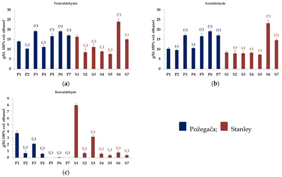 Content of aldehydes (g/hL 100% vol. ethanol) in plum spirits of Požegača (P) and Stanley (S) varieties produced by traditional method (P1 and S1) and modified methods (P2–P7 and S2–S7): (a) TAd, (b) Ad1, and (c) Ad2. (Codes are listed in Table S1 of Supplementary Materials.) For each plum variety, different marks indicate differences in the means (p < 0.05), according to Dunnett test: (↑) Statistically significant higher values compared to values in traditionally produced plum spirit, (↓): Statistically significant lower values compared to values in traditionally produced plum spirit, (-): No statistically significant differences in values compared to values in traditionally produced plum spirit. Concentrations of all parameters are shown as mean ± standard deviation.