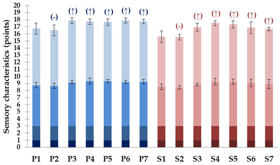 Sensory analysis of plum spirits of Požegača (P) and Stanley (S) varieties produced by traditional process (P1 and S1) and modified process (P2–P7 and S2–S7). Four rectangles from the darkest to the lightest shades of blue (Požegača) and red (Stanley) represent the clearness, colour, odour, and taste of plum spirits. For each plum variety, different marks indicate differences in the means of total sensory quality (p < 0.05), according to Dunnett test: (↑) Statistically significant higher values compared to values in traditionally produced plum spirit, (↓): Statistically significant lower values compared to values in traditionally produced plum spirit, (-): No statistically significant differences in values compared to values in traditionally produced plum spirit. Values of all sensory characteristics are shown as mean ± standard deviation.