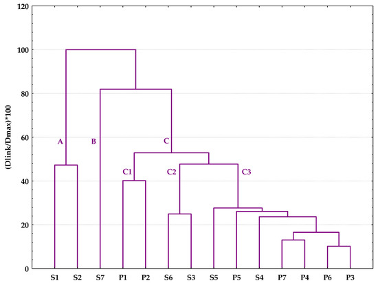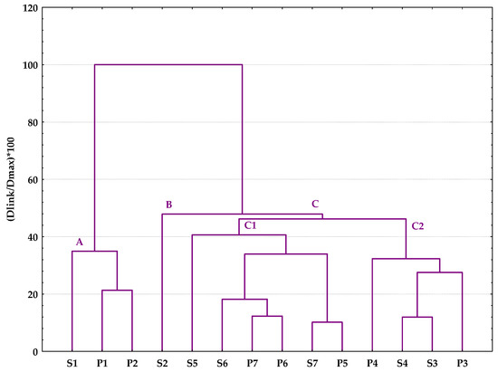 The cluster analysis based on the concentrations of the 23 volatile substances (Figure 6) showed that the plum spirits were separated into three main clusters (A, B, and C). Cluster A contained plum spirits obtained by the distillation of long-stored mashes (P1, P2, and S1), characterized by the concentration of ethyl acetate > 350 g/hL 100% vol. ethanol. The second (B) and third (C) clusters included plum spirits with a concentration of ethyl acetate less than 250 g/hL 100% vol. ethanol. Cluster B only contained plum spirit S2. Within cluster C, divided into two sub-clusters (C1 and C2), there were plum spirits obtained from the mash distilled immediately after fermentation. C1 included all plum spirits from pulped fruits of both varieties (P5–P7 and S5–S7). Sub-cluster C2 contained plum spirits produced from crushed fruits (P3–P4 and S3–S4).