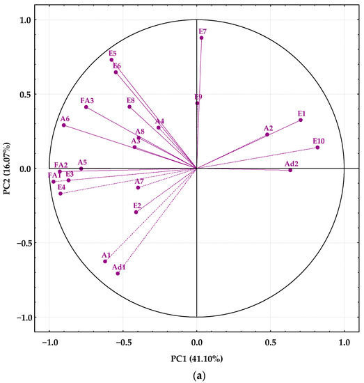 The PC1 was characterized by higher concentrations of 1-butanol (Code A2; codes of volatile components are shown in the Supplementary Materials, Table S1), ethyl acetate (Code E1), ethyl lactate (Code E10), and benzaldehyde (Code Ad2) in the positive loading of this axis, and by higher concentrations of most of the other volatiles in the negative loading of the same axis (Figure 8a). A good separation among plum spirits was observed (Figure 8b). Plum spirits obtained from spontaneously fermented crushed plums (P1–P4 and S1–S4), regardless of mash distillation moment, forms the first group, situated on the positive side of PC1. A second group, situated on the negative side of PC1, is formed by the plum spirits obtained from pulped plums (P5–P7 and S5–S7).