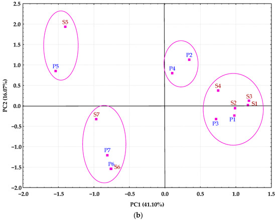 On the negative side of PC1, the second principal component (PC2) showed ethyl decanoate (Code E5), ethyl dodecanoate (Code E6), and ethyl tetradecanoate (Code E7) in the positive loading of axis PC2, and 1-propanol (Code A1) and acetaldehyde (Code Ad1) in the negative loading of the same axis (Figure 8a). Based on this, it follows that two groups can be visualized: plum spirits obtained from the pulped plum mash fermented by commercial yeast strains (P6–P7 and S6–S7) formed one group and plum spirits from the spontaneously fermented pulped plums (P5 and S5) formed the second group (Figure 8b).