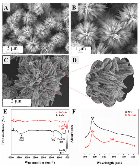 (A,B) SEM images of ZnO materials at low and high magnification; (C) SEM images of ZnO-Au composites; (D) Local magnification image of ZnO-Au composites; (E) FTIR spectra and (F) UV-visible absorption spectra of ZnO flowers and ZnO-Au composites.