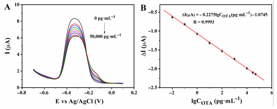 (A) Differential pulse voltammograms of a series of OTA concentrations (0, 0.01, 0.1, 1, 10, 100, 1000, 10,000, 30,000, 50,000 pg·mL−1) using MB/Apt/MCH/cDNA/ZnO-Au/GCE were carried out under optimal conditions. (B) Calibration curve of anodic current (n = 5) obtained from (A) showing a linear range from 0.1 to 30,000 pg·mL−1.