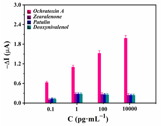 ΔI values for the selectivity of the Ochratoxin A aptasensor against zearalenone, patulin, and deoxynivalenol for different concentrations.