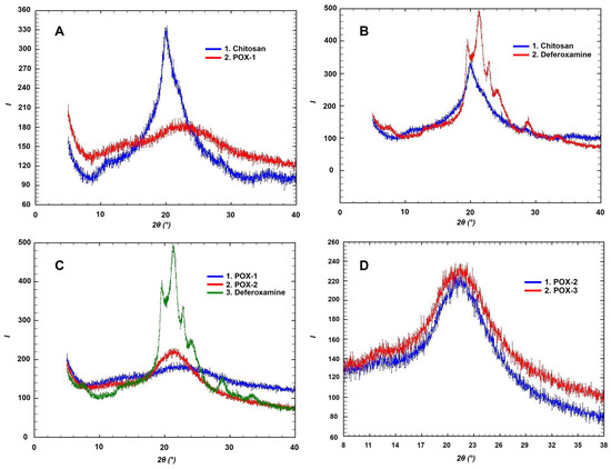 Figure 3. XRD patterns of chitosan and POX-1 (A); XRD patterns of chitosan and deferoxamine (B); XRD patterns of POX-1, POX-2 and deferoxamine (C); XRD patterns of POX-2 and POX-3 (D).