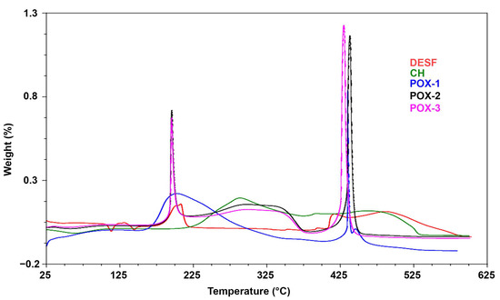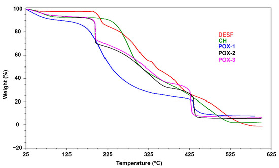 Figure 4. TGA curves of DESF, CH, POX-1, POX-2, POX-3.