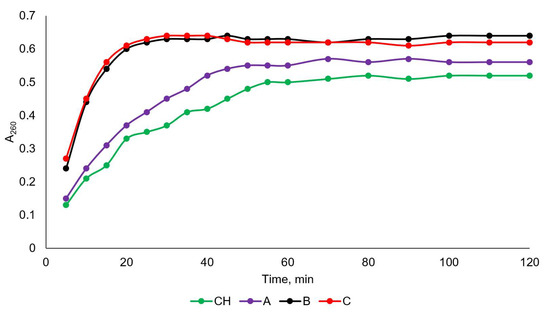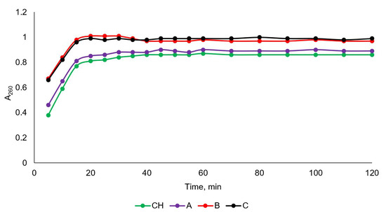 To study the effects of the elaborated systems on the integrity of the microbial membrane, we used spectrophotometry of a suspension of bacterial cells in a 0.5% aqueous solution of sodium chloride in the UV region [42]. This approach is based on the fact that intracellular components are characterized by strong absorption at 260 nm [43]. In preliminary experiments, we found that both deferoxamine and iron(III) chloride did not damage the membranes of the tested bacteria. Thus, we compared the effect of starting chitosan and POX-1, POX-2 and POX-3 on the integrity of the cell membranes of S. aureus and E. coli. The results of the study are summarized in Figure 6 and Figure 7.
