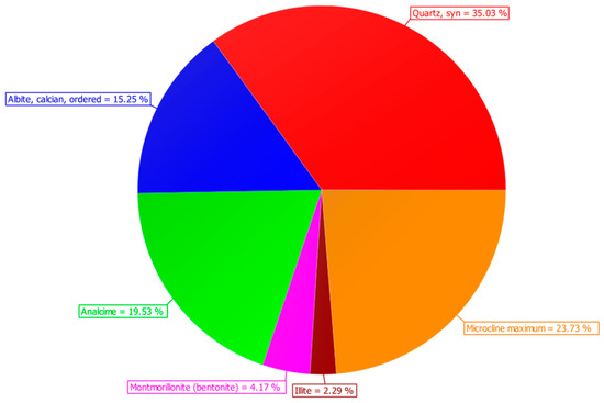 In this study, sandstone samples were collected from the outcrops of the Jurassic Qigu Formation in Urumqi, Xinjiang, China. The outcrop samples were red sandstone with partially visible sedimentary weak surfaces. As shown in Figure 1, through XRD mineral analysis, the mineral composition was mainly quartz, accounting for 35.03%, followed by microcline, calcite, and anorthite, accounting for 23.93%, 19.53%, and 15.25%, respectively. Finally, montmorillonite and illite, accounted for 4.17% and 2.29%, respectively.