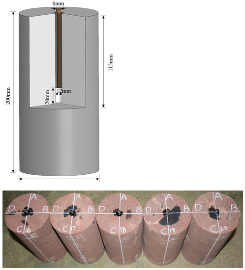 As shown in Figure 2, according to the dimensions of the triaxial chamber, a standard cylindrical specimen with a diameter of 100 mm and a height of 200 mm was used in this experiment. The two ends of the sample were polished with a diamond-face grinder to ensure that the non-parallel error of the two ends did not exceed 0.05 mm, and the end face was perpendicular to the axis of the sample, with a maximum deviation of 0.25°. This step was essential to ensuring the good sealing of the sample and to eliminate any potential liquid leakage during the test. A diamond bit with an outer diameter of 12 mm was used to drill a 115 mm deep round hole in the center of the sample. Kraft K-9741 epoxy resin was used to bond the 95 mm long, 6 mm outer diameter, and 3 mm inner diameter stainless steel pipe to the wellbore wall. A 20 mm open-hole section was reserved at the end of the wellbore for open-hole hydraulic fracturing. In order to reduce non-uniformity, the samples used in the test were selected from multiple samples without obvious macroscopic cracks or defects.