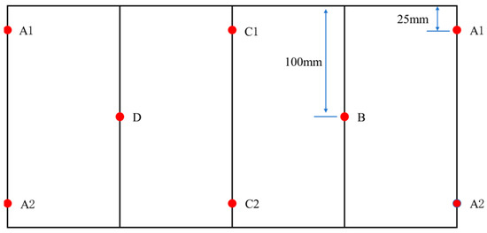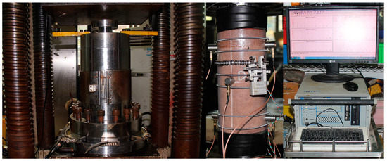 The laboratory hydraulic fracturing simulation test was conducted using the XTR01-01 micro-computer-controlled electro-hydraulic servo rock triaxial tester of the Institute of Rock and Soil Mechanics, Chinese Academy of Sciences. As shown in Figure 3, the equipment is mainly composed of four parts: triaxial loading system, fracturing fluid injection system, data acquisition system, and acoustic emission monitoring system. The maximum axial load of the test system is 2000 kN, and the maximum confining pressure is 60 MPa. The pressure servo booster can operate in constant flow, constant pressure, and programmable program modes, and can control the maximum water pressure of 140 MPa. In addition, in order to prevent fluid leakage and loss, a rubber O-ring was installed in the groove at the end of the wellbore. The acoustic emission monitoring system is composed of acoustic emission sensor, preamplifier, and data-acquisition module. AEwin software was used to visualize and analyze the recorded data. The acoustic emission probe arrangement is shown in the Figure 4. During the hydraulic fracturing test, two people simultaneously clicked the “start” button of the hydraulic fracturing program and the “start” button of acoustic emission to ensure that the pump pressure and acoustic emission data were monitored synchronously.