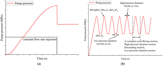 Schematic diagram of pump pressure curve: (a) conventional hydraulic fracturing, (b) cyclic hydraulic fracturing.