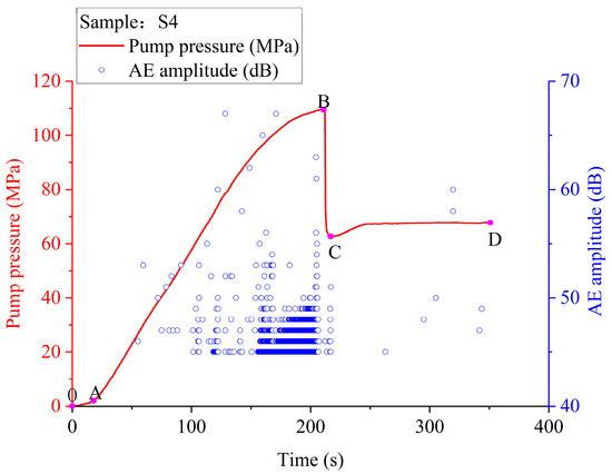 As shown in Table 2, in conventional hydraulic fracturing, the three test results were similar, therefore, only sample S4 is described here. The relationship between pump pressure, AE amplitude, and injection time is shown in Figure 6. Four different stages can be identified in the pump pressure–time curve: the OA section of the wellbore pipeline-filling stage, the AB section of the wellbore pressurization stage, the BC section of the macrocrack propagation stage, and the CD section of the post-breakdown stage. The sample entered the OA section from the beginning of fluid injection. With the injection of fracturing fluid, the pump pressure rose slowly until all accessible pores and microfractures near the open-hole section of the wellbore were filled with fracturing fluid. It then entered the AB section where the slope of the pump pressure curve remained almost unchanged at first before decreasing significantly when it approached the B point. It then entered the BC section, where, with the initiation and expansion of the main induced hydraulic crack until it penetrated the surface of the sample, the pump pressure curve reached its maximum value and then dropped sharply. Finally, it entered the CD section, and under the constraint of the high confining pressure of 50MPa, the induced fracture was rapidly squeezed and closed.