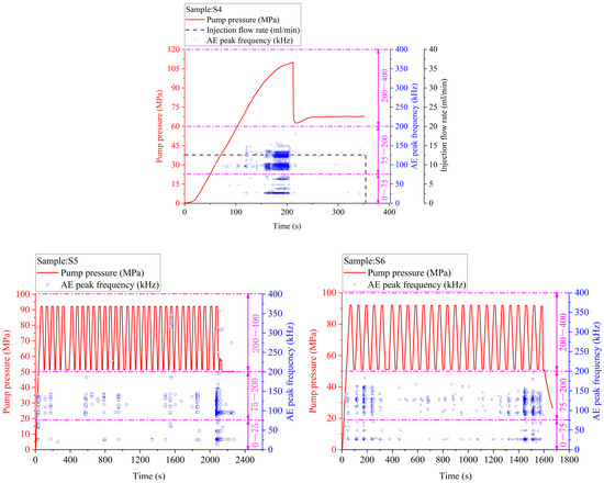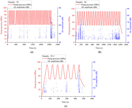 As shown in Figure 7, when the upper limit of the cyclic pump pressure was 90%Pb, under the condition of “high-pressure duration 15 s + low-pressure duration 5 s”, sample S5 was subjected to 32 cycles. In the 32nd cycle, the pump pressure suddenly dropped when it rose from 51.05 MPa to 58.8 MPa, and then dropped to the extension pressure. Under the condition of “high-pressure duration 10 s + low-pressure duration 10 s”, sample S6 was subjected to 25 cycles in total. At the end of the 25th cycle, when the pump pressure was ready to rise at 2.05 MPa/s according to the setting procedure, the pump pressure suddenly dropped from 50%Pb. Under the condition of “5 s for high-pressure duration + 15 s for low-pressure duration”, sample S7-1 was subjected to seven cycles in total. In the 7th cycle, when the pump pressure dropped from 90%Pb to 72.6 MPa, it suddenly rose slightly to 76.4 MPa, and then dropped almost vertically to 50 MPa.