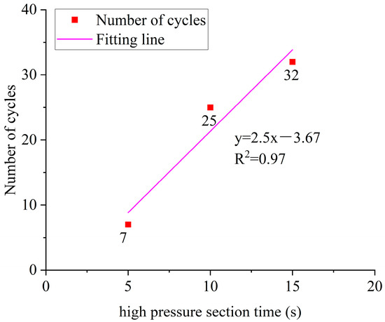 From this, we can get the following understanding: with high-pressure duration decreasing from 15 s to 10 s to 5 s, the cycles required for sample breakdown decreased from 32 to 25 to 7. That is, in this cycle mode, the shorter the high-pressure duration, the fewer the number of cycles required for sample breakdown, the more conducive the sample to the expansion and fracture of test-sample cracks. There was a positive correlation between the high-pressure duration and the cycles required for breakdown, as shown in Figure 8.