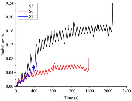 The reason why cyclic hydraulic fracturing can reduce the breakdown pressure is due to fatigue damage. On the one hand, as shown in Figure 9, the maximum radial strain of samples S5, S6, and S7-1 was 0.18%, 0.07%, and 0.06%, respectively. When the high-pressure duration was longer, the fracturing fluid carried more energy for rock deformation, so the energy used to generate hydraulic fractures decreased. On the other hand, low-pressure duration had little effect on rock fatigue damage, while high-pressure duration played a major role. After removing the low-pressure duration, the shorter the high-pressure duration, the more effective the impacts carried out in the same time. The stress change in the rock was greatly affected by the cycle interval, leading to more efficient fatigue damage.