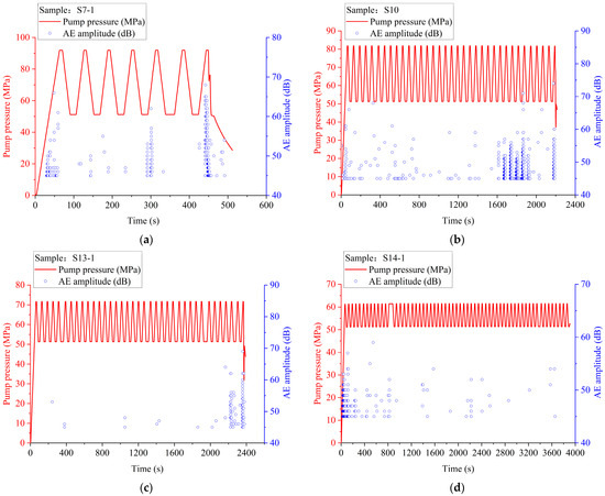 The relationship between pump pressure, AE amplitude, and injection time of samples: (a) S7-1, (b) S10, (c) S13, (d) S14-1.