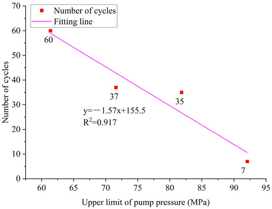 It can be seen that when the upper limit of the cyclic pump pressure decreased from 90%Pb to 60%Pb, the cycles required for sample breakdown increased, from 7 to 35 to 37, even without fracture. That is, in this cycle mode, the lower the upper limit of the cyclic pump pressure, the more unfavorable it was for the crack propagation and breakdown of the sample. There was a negative correlation between the upper limit of the cyclic pump pressure and the cycles required for breakdown, as shown in Figure 11.