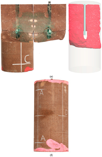 Post-fractured view and scanning reconstruction of hydraulic fracture morphology of cyclic hydraulic fracturing samples: (a) S5, (b) S6, (c) S7-1, (d) S10, (e) S13-1, (f) S14-1.