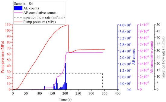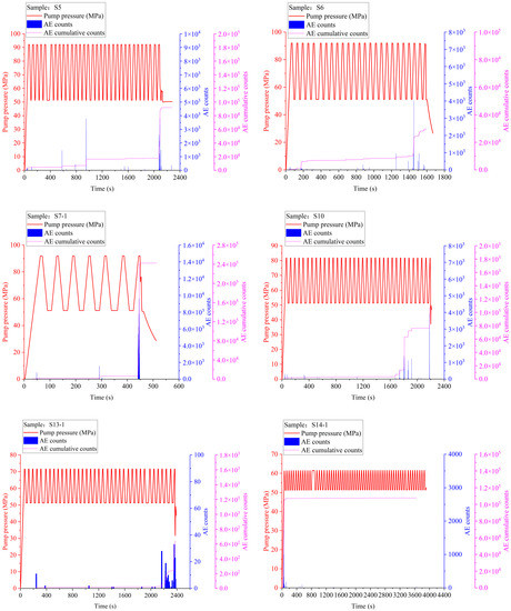 The relationship between the AE cumulative counts and injection time of the samples is shown in Figure 14. In the early stage of fracturing, the AE counts were equal to 0, because the fracturing fluid filled the closed space between the pipeline, the wellbore, and the bottom of the open-hole section of the sample, and there was no microcrack initiation. When the fracturing fluid was filled, the pressure began to increase significantly, and cracks formed inside the sample, resulting in the release of elastic energy. When the fracturing fluid filled the fracture, the pressure increased again, the AE cumulative counts increased, and the curve was concave. This was because of the generation and closure of microcracks, with the AE counts becoming more frequent and active, and the AE cumulative counts curve rising, which meant more severe microcrack growth and greater damage. When the microcracks increased sharply, reached the limit of sample breakdown, macrocracks suddenly appeared and the most severe AE counts during the whole fracturing process occurred. There was no AE response after the fracture of the sample, because the formation of macrocracks in the sample has made it impossible to maintain the pressure to produce micro-damage in the sample. In the whole hydraulic process, the change rule of acoustic emission cumulative counts and the pump pressure curve showed a good response.