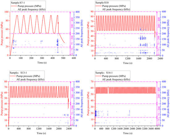 As shown in Figure 15, it can be observed that the peak frequency had a good correlation with the pump pressure curve. The AE peak frequency signal distribution of the sample had obvious coherent and horizontal band characteristics. These peak frequencies can be divided into low frequency, medium frequency, and high frequency, with the range of 0–75 kHz, 75–200 kHz, and 200–400 kHz, respectively. These peak-frequency bands correspond to different damage stages of the hydraulic-fracturing process of the sample.