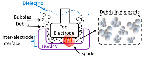 The electric discharge machining process works by a spark erosion mechanism that can machine intricate shapes with high precision in hard-to-cut materials. Hard metals, composites, and difficult-to-cut aerospace alloys are processed without any contemplation of the physical or metallurgical properties. The process employs an electro-erosion mechanism with high-frequency electric sparks to erode the workpiece surface through a cycle of melting, vaporization, and solidification [8,9]. There is no physical contact between the workpiece and the tool electrode. However, both electrodes are entirely immersed in the dielectric medium. During discharge sparking, the dielectric medium becomes ionized to create a pathway for sparks forming a plasma channel in the inter-electrode gap [2]. The material surface goes through melting and vaporization phases because of the sparks’ high energy, which leaves multiple craters behind. The tool electrode carries a mirror shape of the desired geometry. If the electric discharge machining process is categorized into three segments, namely spark initiation, melting and vaporization, and flushing, then one-third of the weightage is given to the latter part [10].
