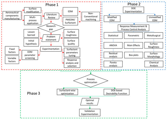 The micro-goals of manufacturing sustainability include the efficient processability of hard-to-cut alloys used in the biomedical, aeronautical, automotive, and nuclear industries [1]. Titanium and its variants are used widely for these hard-to-cut alloys because of their exceptional engineering attributes. The properties include high strength, wear, cryogenic characteristics, and corrosion and wear resistance. Ti6Al4V is widely used in industries among the different titanium variants due to its applicability in high-performance applications [2]. However, the processing of the alloy remains challenging. Along with several engineering benefits, Ti6Al4V proposes challenges such as low thermal conductivity, high strength, and strain hardening, which undermine machining through conventional processes such as turning, milling, and drilling [3]. Therefore, non-conventional machining techniques, such as those using laser beams, electron beams, electric discharge, and plasma arc cutting, are commonly used. In addition to the processability of materials, the desired quality matrix includes surface integrity. For instance, electron beam melting is an additive manufacturing process that fabricates complex shapes; however, inter-layer roughness reduces the product integrity by inducing the risk of fatigue cracks [4]. Moreover, the need for a surface modification remains. Therefore, the earlier processes are continuously evaluated to solve the challenges in generating a good surface finish and properties by devising efficient machine settings. However, electric discharge machining is the preferred choice for machining, which involves cutting the material into the desired shape and enhances the surface hardness, corrosion and fatigue resistance, and other mechanical properties [5]. In addition, the generated electric discharge-machined surface is enriched by oxides and carbides, which enhance the mechanical functionality [6]. The process functions in a narrow tolerance range for high-quality applications. Likewise, the surface integrity achieved through electric discharge machining (EDM) is comparable to that of the conventional grinding process, which contributes as a second-step solution to regular metal-cutting operations [7]. Therefore, electric discharge machining is a considerable choice for producing the work part intended for high-end applications.