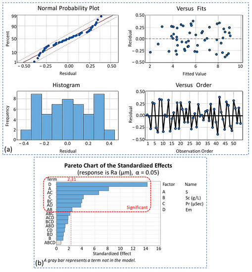 Similarly, the residuals as a function of the order of data collection are shown in Figure 3a, which shows the randomness of the process and parametric effects on the design of experiments. The method also helps evaluate the residual’s independence assumption, which is a baseline for the analysis of variance [33,34]. The desired outcome of the visualization is to identify any obvious patterns subjective to the experimenter’s experience, which may potentially generate bias in data. Therefore, the irregularity affirms the independence of data and satisfies the condition (also affirmed by the Durbin–Watson test of 54 residuals).