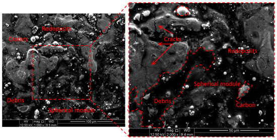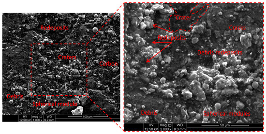 The surface morphology resulted from pure kerosene dielectric (Figure 5) at a pulse ON:OFF time of 50:50 µSec using the graphite electrode shows evidence of debris redeposition (especially carbon due to inefficient flushing [2]), craters, and spherical modules. The redeposition of debris results in a recast layer on the surface, limiting the surface integrity. As established earlier, the crater size drives surface integrity, which is a function of the melting point of the tool electrode [35]. Therefore, higher melting point results in a smoother surface with a relatively smaller crater volume. The mid values of pulse ON:OFF time and graphite’s higher melting point and thermal conductivity resulted in better surface characteristics at the same melting and flushing timings.