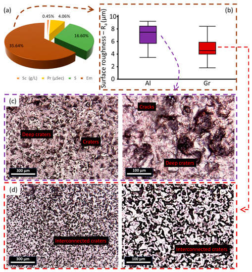 The cryogenic treatment refines the microstructure and improves mechanical properties such as fracture toughness and wear properties [30]. The improvement is driven by the elimination of residual stresses produced during the production of tool electrodes [11,31]. Therefore, the intrinsic properties of the tool electrode are important in generating a uniform surface texture. Several features of craters are presented in Figure 6, such as large-sized, deep, or shallow craters and small-sized, deep, or shallow craters. The collapsing of plasma and the overlapping of craters, making a spongy-like structure, is evident in Figure 6d, which were processed using the graphite electrode. The shallowness of small-sized craters and redeposited debris resulted in less surface roughness. On the other hand, the deep and large-sized craters are evident on the surface (Figure 6c), which were processed using an Al electrode, due to excess heat energy stimulated by the high electrical conductivity of aluminum (35 × 106 S/m). In addition, the Al electrode possesses a low melting temperature of 660 °C, which translates into the erosion of the electrode surface, which is copied on the workpiece surface, leading to poor surface integrity. However, in the case of the Gr electrode, a higher melting point drives the erosion process to a small crater volume and superior surface finish. The interconnected craters (in the case of the Gr electrode) result from uniform sparking, where a spongy surface texture causes less machined surface roughness. It is evident from Figure 6, the cryogenic-treated Gr electrode results in a better surface texture (~4.5 µm) with smaller and interconnected crater boundaries.