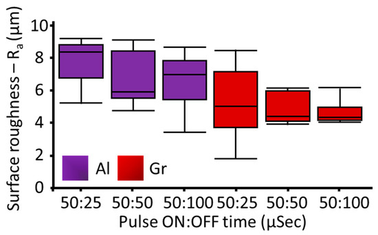 In the case of graphite, it can be observed from the trend line that a decrease in the pulse-OFF time results in a coarser impression compared to that of a higher pulse-off time. The balanced pulse ratio (50:50 µSec) resulted in minimum roughness with both electrodes (~7.5 µm for aluminum and ~5.8 µm for graphite). The aluminum electrode produced more roughness as compared to that of the graphite electrode. The longer pulse-ON time (stimulated by the high electrical conductivity of aluminum 35 × 106 S/m) introduces a high density of electric sparks, inducing heat energy transfer to the surface. Since both of the tools are cryogenically treated, which assists in thermal conduction, the graphite (400 W/m K) behaves better in thermal conduction than aluminum does (205 W/m K), resulting in a lower degree of roughness. The electrical energy generates heat on the surface, which melts the material. Thermal conduction inside the tool results in the dissipation of heat energy, which is not efficiently carried out in aluminum. Therefore, an increased material melt pool is created, leaving a deeper crater behind upon flushing the melt. A similar physical mechanism is endorsed by Kumar et al. [26]. The aluminum generally produced a coarser surface at all pulse ratios. The flushing action improved by decreasing the pulse ratio, resulting in a superior surface finish.