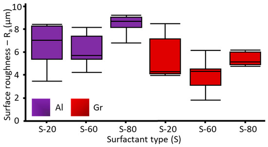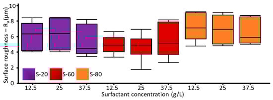 The parametric effect of the surfactant concentration on surface roughness is shown in Figure 13. S-60 has achieved a better surface finish at 12.5, 25, and 37.5 g/L concentrations as compared to those of the other surfactants. It is evident from the statistical analysis that surfactant type affects surface roughness significantly, with a p-value < 0.001. Moreover, the two-way interaction of surfactant type with its concentration also significantly controls the surface roughness, with a p-value of 0.040 and a 95% confidence interval. The roughness values obtained at 12.5 g/L and 25 g/L of S-20 lie in a similar range of ~6 µm. However, a further increase in concentration to 37.5 g/L reduced the surface roughness by around 30%, making it ~4.2 µm. The decrease is caused by increased S-20 proportion in the dielectric, which facilitated the conductivity improvement. In addition, a higher surfactant content enhanced the oil–surfactant emulsion, which aided in debris removal, as evident in Figure 12.