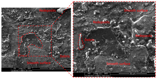 Micrographs of the surface morphology of the kerosene-mixed S-60 dielectric at 25 g/L concentration, 50:100 µSec pulse ON:OFF time, and using the graphite electrode are shown in Figure 10. An improved surface was obtained using S-60 with a reduced degree of redeposited debris, spherical modules, and cracks as compared to those when S-80 was utilized (see Figure 10 and Figure 11). This is because S-60 improves the dielectric conductivity because of the adequate HLB value. In contrast, a lower HLB value (4.3) of S-80 creates an imbalanced machining action mechanism due to the excessive thermal conductivity of the dielectric. The process requires a synergistic relationship between the discharge energy and dielectric conditions. Excessive thermal conductivity also reduces the surfactant’s efficacy [15,23]. For instance, in the case of the Al electrode, S-80 resulted in ~22% and 34% increases in the Ra values compared to those of the S-20 and S-60 dielectrics, respectively. Additionally, in the case of the Gr electrode, a 15% deteriorated surface roughness was recorded for S-80 compared to that of the S-60-based dielectric. Therefore, a balanced choice is preferred with an optimized combination of electrode material and surfactant type. This is because when the surface tension of a dielectric is adequately reduced, a balanced sparking phenomenon occurs in the inter-electrode interface due to higher conductivity and efficient debris removal.